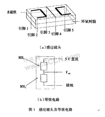 用銻化銦-銦共晶體薄膜磁阻元件制成MRCS的感應(yīng)磁頭(圖1)主要由導(dǎo)線、絕緣基片、InSb-In磁阻元件MR1和MR2、永磁體、5個引腳等組成,另外加上起屏蔽和保護(hù)作用的金屬外殼。MR1和MR2是相對放置的一對磁阻元件,其阻值大致相等,導(dǎo)線置于MR1和MR2的對稱軸位置。其等效電路如圖1(b)。
