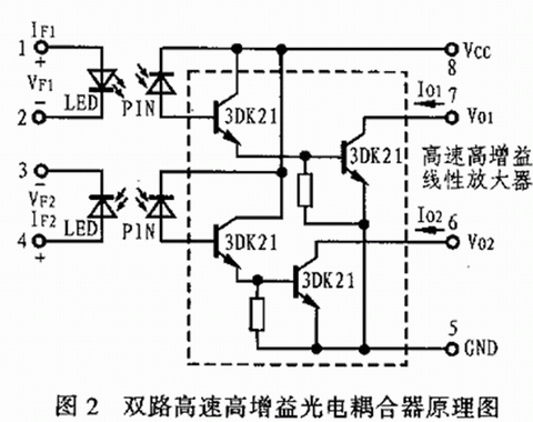 近幾年來(lái),國(guó)內(nèi)有關(guān)單位投入大量人力物力也研究和開發(fā)了各種光電耦合器件。如上海半導(dǎo)體器件八廠、上海無(wú)線電十七廠等。而重慶光電技術(shù)研究所為了適應(yīng)市場(chǎng)需要研制出了一種由高速響應(yīng)發(fā)光器件和邏輯輸出型光接收放大器組成的厚膜集成雙路高速高增益電耦合器。這種光電耦合器的輸入端由兩只GaAIAs側(cè)面發(fā)光管組成,其輸出端由兩只Si—PIN光電探測(cè)器以及兩個(gè)高速高增益線性放大電路組成。圖2所示為其原理電路圖,除此之外,重慶光電技術(shù)研究所還研制出了高速高壓光電耦合器、GG2150I型射頻信號(hào)光電耦合器、GG2060I型高壓脈沖測(cè)量光電耦合器、GH1204U型高壓光傳輸光電耦合器以及 GH1201Y型和GOHQ-I型光電耦合器等。