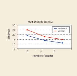 橫向和縱向結(jié)構(gòu)兩者ESR性能之間的差異如圖2所示。這個(gè)例子是基于對(duì)D類電容器的理論計(jì)算,圖2表明,兩陽(yáng)極橫向結(jié)構(gòu)與三陽(yáng)極系統(tǒng)的縱向結(jié)構(gòu)的ESR值相似。然而,相對(duì)而言橫向結(jié)構(gòu)在ESR上性價(jià)比優(yōu)勢(shì)更顯著。