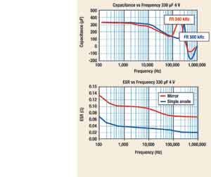 鏡像結(jié)構(gòu)如果使用更薄的陽(yáng)極,電容將隨頻率下降至更低。鏡像設(shè)計(jì)的共振頻率改變,其原因是目前一般的DC/DC轉(zhuǎn)換器其開(kāi)關(guān)頻率的工作范圍(250~500kH)會(huì)因降低ESL而顯著升高。