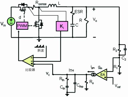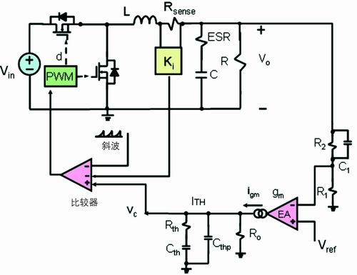 通過前面的討論可知,在每個(gè)開關(guān)周期,低端的開關(guān)管流過的電流波形為下降階段的梯形波。這種電流模式常稱為谷點(diǎn)電流模式。和峰值電流模式一樣,谷點(diǎn)電流模式反饋也有兩個(gè)環(huán)路:一個(gè)電壓外環(huán),另一個(gè)是電流內(nèi)環(huán)(見圖2)。