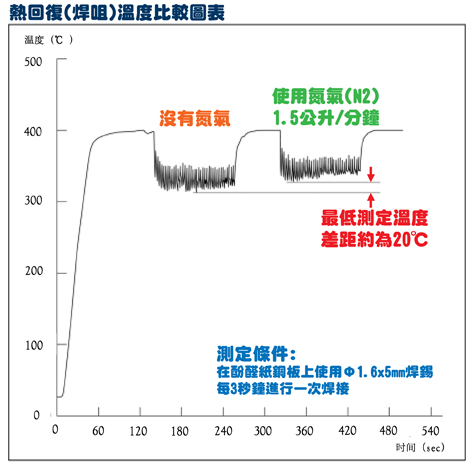 下圖表示當(dāng)焊咀前端吹出氮?dú)夂蜎](méi)有使用氮?dú)鈺r(shí),焊咀溫度變化的比較。由此可以證明在使用熱氮?dú)獾那闆r下,如果要把焊點(diǎn)提升到相同的溫度,焊咀便能夠設(shè)定較低的溫度進(jìn)行焊接。