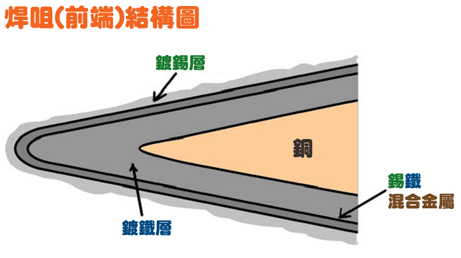進(jìn)行焊接時(shí),錫跟鐵會(huì)不斷產(chǎn)生混合反應(yīng),而由于所產(chǎn)生的混合金屬會(huì)從焊咀鍍層表面剝落,因此焊咀鍍層會(huì)逐漸被侵蝕掉,繼而錫會(huì)很快速地侵蝕焊咀內(nèi)的銅,最后會(huì)在很短時(shí)間內(nèi)造成焊咀穿洞(圖4)。