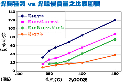 相比起傳統(tǒng)的共晶焊錫(63/37焊錫),在400℃的焊接溫度下,無(wú)鉛焊錫 錫+3.5銀+0.7銅 對(duì)焊咀的侵蝕速度要快3倍,而 錫+0.7銅更加要快4倍。