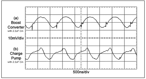 圖5.如果開(kāi)關(guān)頻率為1MHz,驅(qū)動(dòng)同樣數(shù)量的LED,采用相同的輸入電容,那么電荷泵(b)和升壓轉(zhuǎn)換器(a)的輸入紋波基本相同。然而,由于電荷泵與LED之間有較多引線,建議使用更短的連線(天線),另外,泵電容產(chǎn)生的EMI低于升壓轉(zhuǎn)換器的電感。