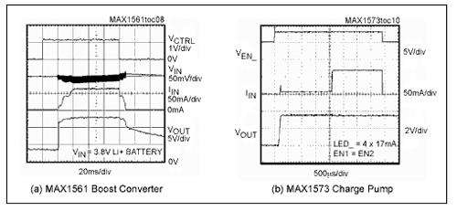 圖6.MAX1561升壓轉(zhuǎn)換器(a)和MAX1573電荷泵(b)的軟啟動(dòng)和關(guān)斷波形都表明沒(méi)有輸入過(guò)沖電流(IIN),使電池跌落最小,以免對(duì)系統(tǒng)的其它電路造成影響。