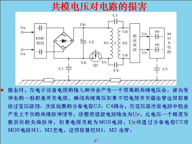 下面講一下共模電壓對電路的損害。其實共模電壓對開關(guān)電容前面的影響不是很大,最大是后面一點,通過電壓器分布電路,以前的模式電路電壓用得很低,都是1v-5v左右,納米級容易擊穿,電容也相當(dāng)小。從里面串進(jìn)去的電壓經(jīng)過濾波不斷的吸收降下來,一般有上千伏,容易把后面的擊穿。在實踐過程中為了防雷,這幾個位置最好在上面布一個雷點電容,對防雷電擊穿很有效。共模電壓進(jìn)去以后瞬間擊穿,如果電子沒斷開,外面的電流會繼續(xù)延續(xù)下去把它燒掉,如果備一個電容上去,共模電容通過電容一下子把它吸收掉,讓幾個電容互相通電位,幾個模組不會那么容易擊穿。