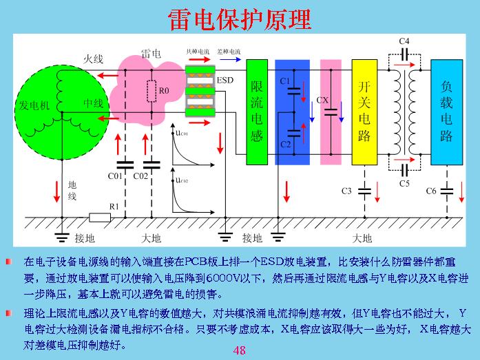 大家想想看,跟前面我們所說的,感應(yīng)雷這個東西沒有一個標(biāo)準(zhǔn)的概念說什么叫做感應(yīng)雷。只要打雷的話,外面打雷,窗戶上面的金屬,如果夜間都可以看到放電產(chǎn)生火花,這就是通過電磁感應(yīng)產(chǎn)生的位移電流原理。從原理上來說,三相四線或三相五線,發(fā)電機(jī)有中線接地,設(shè)備使用者的外殼接地是最有效的避雷方法,但現(xiàn)在很多設(shè)備都不接地,沒有辦法接,只有很貴重的進(jìn)口設(shè)備用三相電源,中間那一條地線,地線不是中線,大家要搞清楚。中線雖然是接地的,但在這里不能當(dāng)成地線,地線一定是自己大樓本身的地,而且要量好接地的地線。因為地線接進(jìn)去以后,大樓對外面的電磁層進(jìn)行屏蔽了,大樓相對來說也是導(dǎo)電的,就算不導(dǎo)電,現(xiàn)在國家都有安全要求,大樓超過多少層都要加上避雷針,就是防雷的。如果不能接地,你就要考慮充放電的問題。前面最好的共模電容我覺得還是要,我認(rèn)為這個共模電容最好連接上,不能接大地,要接在外殼上,接到外殼上有什么好處?共模電壓一進(jìn)來,雖然電流沒有通過地放電回路,把電壓舉高起來了,與外面輸入電壓是一樣的,外殼電壓取的一樣,起到了屏蔽作用。如果這個接地的話會更加安全,但是地線要足夠粗,回路也足夠,因為放電的電流很大,很容易燒掉。這幾個東西是經(jīng)過很多年的試驗,8是很成熟的東西,不管做共模還是防雷都要做上,如果連機(jī)殼都沒有,只是塑料殼,也要考慮這根線接到什么位置最好?是接到里面面積最大的地方,就是公共地面積最大的地方,讓電位舉起來,其他電位差不會產(chǎn)生很大的電容回路。主要是考慮充放電回路,電流越小越好,兩個電位差越小越好。