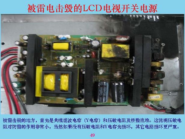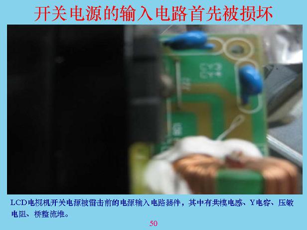 下面我們講一些具體的。這是一個開關(guān)電源,開關(guān)電源被雷劈的時候,輸入回路基本上都燒了,假如沒燒是什么樣的?可以看看,這是橋堆,這兩個是Y電容,這里面還有一個壓敏電阻。這是共模線圈,雷劈以后全部燒了,說明壓敏電阻沒有起到什么保護(hù)作用,兩個電容都燒了,說明電感相當(dāng)、相當(dāng)?shù)馗?。為了防止雷電,首先前面一定要加一個能量吸收,比較大的東西,成本相對來說比較低,像試驗站里面的放電裝置,那個東西沒有地方裝,也貴得很。在硬紙板上面排幾個鋸齒,中間隔一個頭就行了。如果中間隔6mm也可以。有一個一級電感,電感可以使瞬間上去很快的電壓降下來,突然加一個1萬伏、10萬伏,加上去只有這兩端,另外兩端建立不起來,所以剛加進(jìn)去的時候?qū)纂妬碚f,大部分能量都被吸收掉了。后面經(jīng)過這個以后,剩余部分通過共膜電容繼續(xù)吸收,吸收完以后還有差模部分,產(chǎn)生的差模部分通過電容把差模吸收掉。共模電容和差模電容具有抑制傳導(dǎo)干擾的作用,對雷電也有抑制作用,所以很多人也在問,電容接到前面好還是接在后面好?這個東西看你有什么作用,如果只是為了防EMI電磁干擾的話,接在越前面越好,接在測試儀表的輸入端最好,接到那里把信號全部短路掉了,就看不到了。但是對于雷電,你接到后面要好很多,所以這主要是防雷的,你就不要考慮電磁干擾和EMC了,盡量把兩個放在后面。
