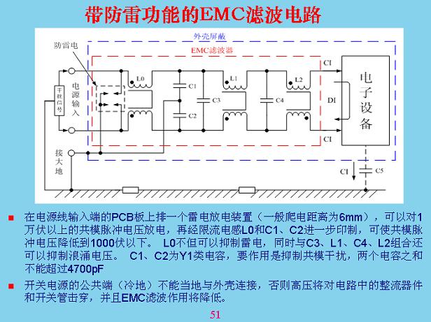 按照道理EMI是電磁干擾,避雷元器件按照道理并不聯(lián)系在一起,但EMC濾波里面,與EMC濾波器同樣有防雷功能,就是前面的幾個電感和共模電容還有差模電容對防雷都起到作用,大家要理解,EMC濾波是用于設(shè)備上的,但反過來考慮雷電的時候,你就要把干擾信號從外面輸進(jìn)來,要這樣考慮了,不能單方面,最好在防雷加上一個放電裝置加在電感后面,共用共模濾波電容。