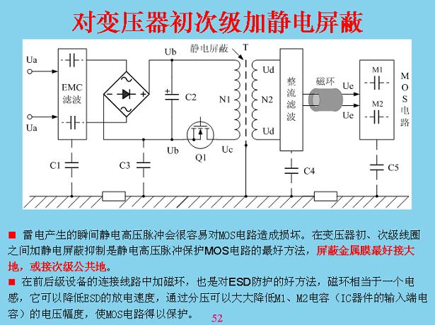 對于一些比較貴重的儀器、設(shè)備,在開關(guān)電容電壓器這里最好做靜電比例,在初次級線圈中間做一個鋁箔片都可以,包一層,這層不能短路,短路的話變壓器就會燒掉,包在外面可以短路,包在里面不能短路,包在外面吸收漏電電感,包在里面的主回路里面會短路,然后把它進(jìn)行接地,這相當(dāng)于可以隔離掉。這個有一個教訓(xùn),前段時間康佳臺灣裝LCD屏測試,打了一個隔離變壓器,后面就是接測試儀表,每個月都有一臺、兩臺測試儀表損壞,查不出原因,最后讓他們把隔離變壓器的中間屏蔽才好。屏蔽以后,進(jìn)一步有機(jī)會的話,在接頭有連接的地方加一個磁環(huán),讓共模電壓將磁環(huán)速度放慢,緩沖一下,讓瞬間能量降低,瞬間能量緩慢一點,慢慢的過,損傷就會少很多。所有電路都可以把它看成一個分布電流,只要某地方電壓電位在改變,對后面都會產(chǎn)生充放電,從這上面理解就知道了,如果哪個地方構(gòu)成回路,如果有一個高電壓進(jìn)來一直傳導(dǎo)到后面,最后充電,充電可以理解成分布電容,如果沒有這個也有一個分布電容在里面,把分布電容放在這里,就比較形象地。就像以前的絕緣長效濾管一樣,手一摸沒有造成回路也壞掉了,絕緣的濾管很容易壞,一從里面拿出來,手一摸就壞掉,一個身上面帶正電,或者你作為天線有感應(yīng)電壓,感應(yīng)一下來回充放電就壞掉了。