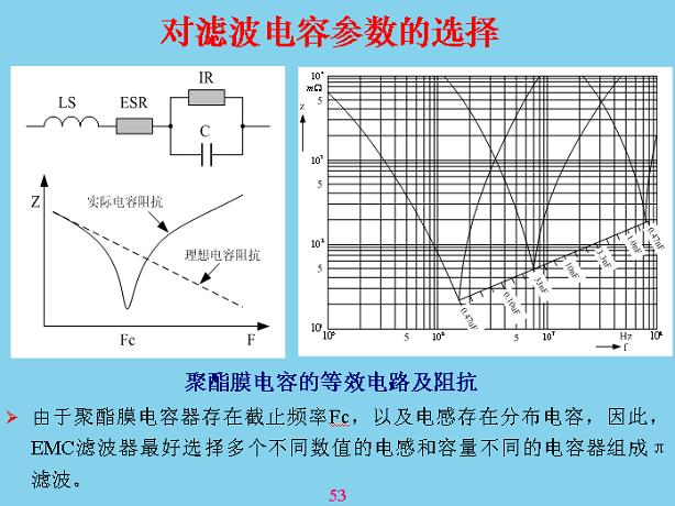 對于濾波電容,大家注意前面的EMC濾波,這個電容不是理想電容,里面有一個電感,還有漏電電阻,里面有串聯(lián)電阻,電感和電容有沒有產(chǎn)生串聯(lián)諧振?曲線是這樣一條斜線,串聯(lián)諧振相當(dāng)于把信號短路掉了,信號短路的阻礙很大,這里面有一個最佳值,然后成為感線,進(jìn)行EMC電路設(shè)計的時候最好用不同的電容進(jìn)行配模,這是0.4的曲線,33nF并聯(lián)就可以保證在上面不是好的,單獨一個電容后面覆蓋不到,以后有機(jī)會我講這些元器件,你們在大學(xué)里面學(xué)的是符號,對電阻電容基本是不懂的,還有電組電容這方面的問題最多,還有電容,電容來回極化的時候,速度跟不上外面的變化,會損耗相當(dāng)大,會燒壞,特別是脈壓電容,很多人認(rèn)為體積越小越好,但沒有考慮在開關(guān)上容易出現(xiàn)問題。