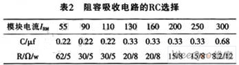 模塊過(guò)壓保護(hù)一般也可采用阻容吸收法。對(duì)于持續(xù)時(shí)間較短,能量不大的過(guò)電壓,一般可在模塊兩端并聯(lián)阻容吸收電路,用吸收電容把過(guò)電壓的電磁能量變成靜電能量存貯起來(lái)。而用吸收電阻不但可以防止電路振蕩,還可限制晶閘管導(dǎo)通時(shí)電容放電所產(chǎn)生的開(kāi)通損耗和di/dt值。并聯(lián)在晶閘管開(kāi)關(guān)模塊的RC值可參考表2。