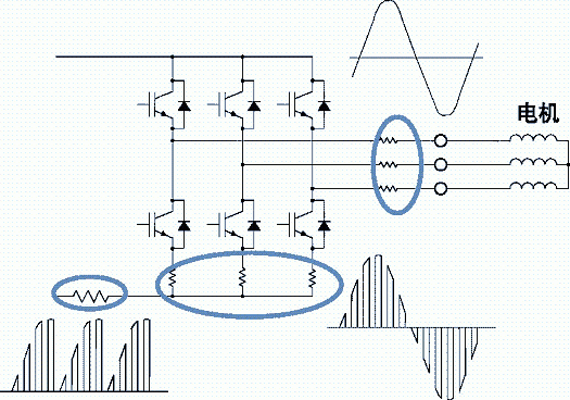 實際上,電流信號可以通過與下列結(jié)點相連接而被取樣:正或負DC總線、單IGBT相位腳、或電機相位超前,如圖1所示。不管在哪個DC總線上取樣的電流信號,都是所有IGBT相位腳電流的矢量和。