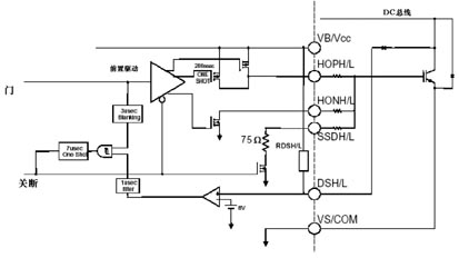 在DSH/L針腳提供主動式偏壓結(jié)構(gòu),目的是降低IGBT處于OFF時流過二極管寄生電容和內(nèi)部上拉電阻電流的噪聲效應(yīng)。DSH/L給VB/VCC提供相應(yīng)的主動式上拉,給VS/COM提供相應(yīng)的下拉。當(dāng)電壓超過VDESAT臨界電壓的時候,專用偏壓電路可以降低DSH/L針腳的阻抗。當(dāng)IGBT處于完全開啟的時候,感測二極管變?yōu)轫樒?,DSH/L針腳上的電壓就下降了。這時,偏壓電路不再起作用,目的是降低二極管的偏壓電流。