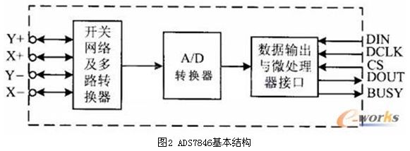 觸摸屏控制器有多種,主要的功能均是在微處理器的控制下向觸摸屏的兩個方向分時施加電壓,并將相應的電壓信號傳送給自身A/D轉換器,在微處理器SPI口提供的同步時鐘作用下將數字信號讀入微處理器??刂破鰽DS7846基本結構如圖2所示。