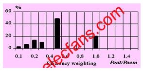 對(duì)于傳統(tǒng)電力電子裝置的設(shè)計(jì),我們通常是通過每千瓦多少錢來衡量其性價(jià)比的。但是對(duì)于光伏逆變器的設(shè)計(jì)而言,對(duì)最大功率的追求僅僅是處于第二位的,歐洲效率的最大化才是最重要的。因?yàn)閷?duì)于光伏逆變器而言,不僅最大輸出功率的增加可以轉(zhuǎn)化為經(jīng)濟(jì)效益,歐洲效率的提高同樣可以,而且更加明顯。歐洲效率的定義不同于我們通常所說的平均效率或者最高效率。它充分考慮了太陽光強(qiáng)度的變化,更加準(zhǔn)確地描述了光伏逆變器的性能。歐洲效率是由不同負(fù)載情況下的效率按照不同比重累加得到的,其中半載的效率占其最大組成部分(見圖1)。