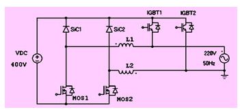 在圖13中,上橋臂igbt的開關(guān)頻率一般設(shè)定為電網(wǎng)頻率(例如50hz),而下橋臂的mosfet則工作在較高的開關(guān)頻率下,例如 16khz,來實(shí)現(xiàn)輸出正弦波。仿真顯示,這種逆變器拓?fù)湓?kw額定功率輸出時(shí),效率可以達(dá)到99.2%。由于mosfet內(nèi)置二極管的速度較慢,因此 mosfet不能被用在上橋臂。