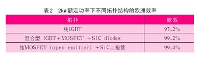圖16所示拓?fù)浣Y(jié)構(gòu)允許純無功負(fù)載,能夠提高對(duì)電網(wǎng)的無功補(bǔ)償,也能滿足雙向功率流動(dòng),例如實(shí)現(xiàn)高效電池充電。如果應(yīng)用sic肖特基二極管,這種電路拓?fù)鋵⒖梢赃_(dá)到更高的效率等級(jí)。表2是2kw額定功率下不同拓?fù)浣Y(jié)構(gòu)的歐洲效率