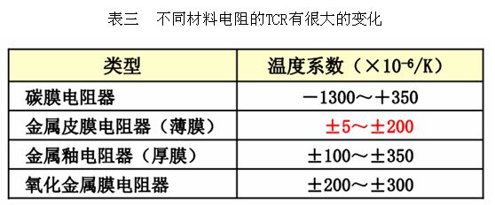 目前TCR小的電阻器只有薄膜電阻,一般情況下,碳膜與陶瓷電阻器TCR為負,對于低TCR設計,首選推薦10ppm。不同材料電阻的TCR有很大的變化,大致范圍可以從下表看出: