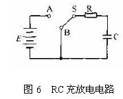 RC充放電電路如圖6所示。圖中開關(guān)S原來停留在B點(diǎn)位置,電容器C上沒有電荷,它兩端的電壓等于零。當(dāng)開關(guān)接到A點(diǎn)時(shí).電源E通過R向電容器 C充電,在電路接通的瞬間,電容器電壓Vc=0,充電電流最大值等于Z/R。隨著電容器兩極上電荷的積累,Vc逐漸增大,電阻器R上的電壓Vr =E -Vc,充電電流i=(E—Vc)/R且隨著Vc的增大而越來越小,Vc的上升也越來越慢。當(dāng)Vc=E時(shí),i=0,充電過程結(jié)束。
