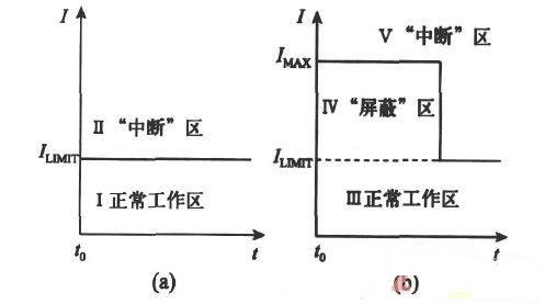 當負載電流超過限制電流ILIMIT 不太多且持續(xù)作用時間不太長時,我們希望過流保護電路能保持LDO 不中斷工作,因此需要采用“屏蔽”模式屏蔽掉部分可以讓LDO 不中斷運行的過流信號,對于過流幅值和持續(xù)作用時間超過范圍的過流信號,過流保護電路又能采取中斷LDO 工作的模式。傳統(tǒng)的“中斷”模式電流保護電路工作狀態(tài)如圖1(a)所示,分為正常工作區(qū)Ⅰ和“中斷”區(qū)Ⅱ,當負載電流不超過ILIMIT 時,LDO 工作在正常工作區(qū),當負載電流超過ILIMIT 時LDO 進入“中斷”區(qū)。加入“屏蔽”模式后的過流保護電路工作狀態(tài)如圖1(b),分為正常工作區(qū)Ⅲ、屏蔽區(qū)Ⅳ以及中斷區(qū)Ⅴ,當負載電流小于ILIMIT 時,LDO 處于正常工作區(qū),當過流信號的幅值在ILIMIT 和最大幅值電流IMAX 之間,持續(xù)作用時間在t=tMAX 之內(nèi)即同時滿足ILIMIT ≤ ILOAD ≤ IMAX,t ≤tMAX 時,LDO 進入屏蔽區(qū),這個范圍之外的過流信號將進入中斷區(qū)。對比圖1(a)和(b)可以看出,改進過流保護電路后的LDO 的正常工作區(qū)包括圖1(b)的正常工作區(qū)Ⅲ和“屏蔽”區(qū)Ⅳ,增大了工作區(qū)的范圍,提高了LDO 的工作效率。