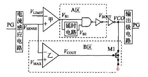 圖3 虛框B 區(qū)電路能解決屏蔽時間內(nèi)大電流可能導致功率管瞬間燒毀的問題,當延遲時間內(nèi)出現(xiàn)很大過流信號時,能及時關斷功率管,保證系統(tǒng)安全。關斷電路由比較器乙和NMOS 開關管M1 組成。
