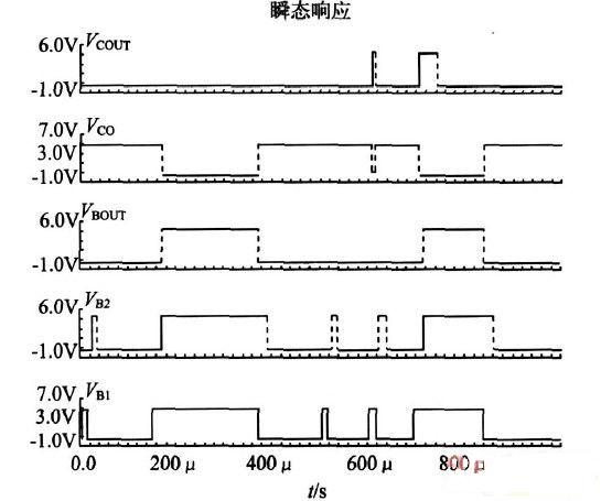 “屏蔽”模式的邏輯關系如圖4 所示,其中VB1和VCOUT 分別為比較器甲和乙的輸出信號,VB1 經(jīng)過一個延遲時間后輸出信號為VB2,屏蔽電路輸出電壓為VBOUT,VCO為屏蔽電路的輸出端。VB1、VB2和VBOUT的波形反應了屏蔽電路的邏輯關系,只有當VB1 和VB2 同時為高電平,VBOUT 才為低電平,否則VBOUT 一直為高電平,因此屏蔽電路屏蔽了延遲時間內(nèi)的脈沖信號,保持寬脈沖信號;VCOUT為使能端,只要VCOUT為高電平,VCO 立即變?yōu)榈碗娖健?/p>