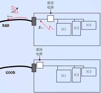 對于時鐘線、總線、射頻線等強輻射信號線和復(fù)位信號線、片選信號線、系統(tǒng)控制信號等敏感信號線,應(yīng)遠(yuǎn)離接口外出信號線。從而避免強輻射信號線上的干擾耦合到外出信號線上,向外輻射;也避免接口外出信號線帶進來的外來干擾耦合到敏感信號線上,導(dǎo)致系統(tǒng)誤操作。