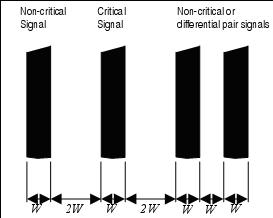 布線分離的作用是將PCB同一層內(nèi)相鄰線路之間的串?dāng)_和噪聲耦合最小化。3W規(guī)范表明所有的信號(時鐘,視頻,音頻,復(fù)位等等)都必須象圖10所示那樣,在線與線,邊沿到邊沿間予以隔離。為了進一步的減小磁耦合,將基準(zhǔn)地布放在關(guān)鍵信號附近以隔離其他信號線上產(chǎn)生的耦合噪聲。
