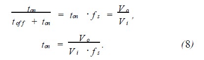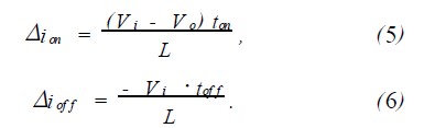可以認為Δi就是電感線圈中的紋波電流,將導通和關斷狀態(tài)時的時間和電壓式(2)和式(3)代入上式,分別寫出導通狀態(tài)和關斷狀態(tài)時的紋波電流表達式: