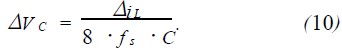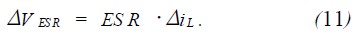 計算第二部分,對于一般電容,都具有串聯(lián)等效電感和串聯(lián)等效電阻(其實還有并聯(lián)等效絕緣電阻)。串聯(lián)等效電感只在較高頻率時起作用,在分析開關頻率時可以將其忽略,但必須考慮的是串聯(lián)等效電阻ESR.電流ΔiC流過ESR時,會在ESR兩端產(chǎn)生電壓降,其值為: