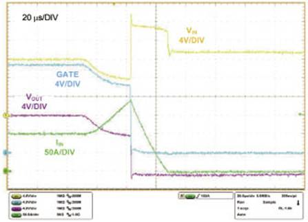 由于在檢測到故障之前允許建立起盡可能高的電流,圖1中電路的輸出兩端直接拉低的零阻抗短路尤其麻煩。在短路故障響應(yīng)時(shí)間之后,通路MOSFET最終是由“斷路器”故障條件下的熱插拔控制器命令關(guān)閉的,同時(shí)正向電流迅速被中斷。