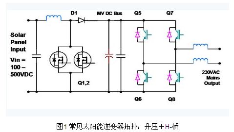 升壓+H-橋拓?fù)涫翘柲苣孀兤鳂O為常用的拓?fù)渲?,是一種兩級非隔離拓?fù)?。其第一級是升壓級,用于把模塊的可變輸出電壓(例如100V – 500V)升高到更大的中間電壓,后者必須大于實(shí)際峰值主線電壓(如230V x sqrt(2),或>325V)。該升壓級還有一個(gè)重要作用,就是為了實(shí)現(xiàn)效率最大化,太陽能模塊必須運(yùn)作產(chǎn)生盡可能大的功率,而太陽能模塊的功率 曲線可通過輸出電流乘以輸出電壓數(shù)值獲得。功率特性中有一個(gè)最大點(diǎn),被稱為“最大功率點(diǎn)”或MPP,而這精確位置會隨著模塊的類型、溫度和日照陰影等因素而變化。