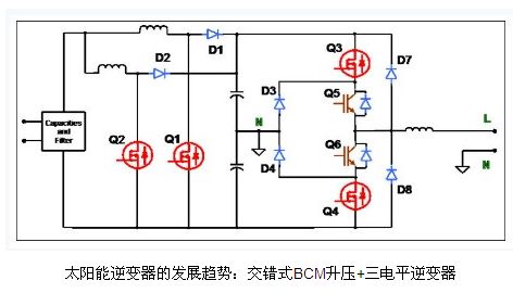 有很多方法能夠提高升壓逆變器的效率。由于升壓逆變器可在連續(xù)傳導(dǎo)模式或邊界傳導(dǎo)模式(CCM 或 BCM)下工作,這就衍生出不同的優(yōu)化方案。在CCM模式中,損耗的一大主因是升壓二極管的反向恢復(fù)電流;在這種情況下,一般使用碳化硅二極管或飛兆半導(dǎo)體的Stealth 二極管來解決。太陽能逆變器更常采用的是BCM模式,而盡管對這類功率級通常建議選擇CCM模式,但采用BCM模式的原因在于BCM模式中二極管的正向電 壓要低得多。而且,BCM模式也具有高得多的EMI濾波器和升壓電感紋波電流。這時(shí),良好的高頻電感設(shè)計(jì)是一解決方案。