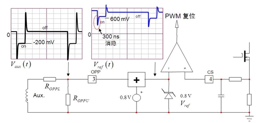 如圖 1 所示,電路中的光耦合器斷路或 TL431 分壓器網(wǎng)絡(luò)遭受嚴(yán)重漂移影響(或其某個電阻丟失或出現(xiàn)錯誤值)時,輸出電壓就可能超出規(guī)定的限制值,這就是過壓條件。大多數(shù)情況下,過壓條件可能對下行負(fù)載有害,適配器這時必須完全關(guān)斷。NCP1250/1 在 OPP 引腳上也集成了 3 V 參考比較器,這比較器可用于多種功能,如 OVP。如果這 OPP 引腳電壓連續(xù)四次超過 3 V,就使控制器 IC 閂鎖保護。