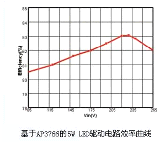 圖2為該方案的5W應(yīng)用電路樣機(jī)實(shí)物照片。圖3是基于AP3766的5W LED驅(qū)動(dòng)裝置實(shí)物照片。圖4為基于AP3766的5W LED驅(qū)動(dòng)電路滿載效率隨交流輸入電壓變化曲線。圖5為基于AP3766的5W LED驅(qū)動(dòng)電路滿載輸出IV特性曲線。