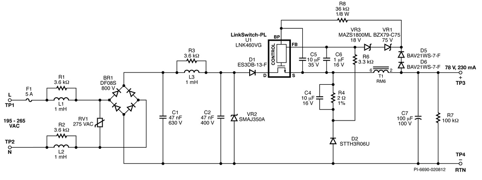 注意:本設(shè)計利用DER-305 PCB板制作,最大限度地利用了LNK460VG器件散熱器的面積。