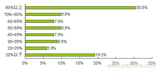 根據(jù)調(diào)查,89%的公司2011年傳感器采購(gòu)總額在5千萬(wàn)以下,其中采購(gòu)總額在1千萬(wàn)以下的占到69%。采購(gòu)傳感器進(jìn)口產(chǎn)品所占百分比呈現(xiàn)兩極分化,進(jìn)口產(chǎn)品所占百分比在80%以上和20%以下的情況最多,有30.5%的整機(jī)制造商傳感器進(jìn)口產(chǎn)品達(dá)到80%以上,19.5%的公司進(jìn)口產(chǎn)品在20%以下。
