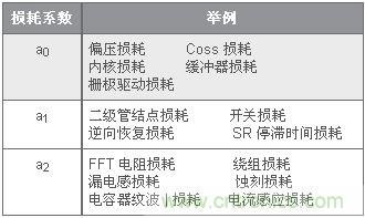 表1概括總結(jié)了各種電源損耗項(xiàng)及其相關(guān)損耗系數(shù),該表提供了一些最佳化電源效率方面的折中方法。例如,功率MOSFET導(dǎo)通電阻的選擇會(huì)影響其柵極驅(qū)動(dòng)要求及Coss損耗和潛在的緩沖器損耗。低導(dǎo)通電阻意味著,柵極驅(qū)動(dòng)、Coss 和緩沖器損耗逆向增加。因此,您可通過(guò)選擇MOSFET來(lái)控制a0和a2。