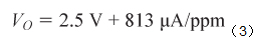 傳感器的最大響應(yīng)為90 nA/ppm,如表2所示,其最大輸入范圍為2,000 ppm。因此,最大輸出電流為180 μA,最大輸出電壓由跨導(dǎo)電阻決定,如公式2所示。