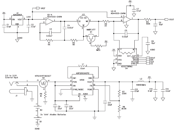 該電路由兩節(jié)AAA電池供電。使用二極管提供反向電壓保護(hù)會(huì)浪費(fèi)寶貴的電能,因此本電路使用P溝道MOSFET (Q2)。該MOSFET通過阻塞反向電壓來保護(hù)電路,施加正電壓時(shí)導(dǎo)通。MOSFET的導(dǎo)通電阻小于100 mΩ,因此它引起的壓降遠(yuǎn)小于二極管。除AAA電池以外,降壓-升壓調(diào)節(jié)器ADP2503還允許使用最高5.5 V的外部電源。在省電模式下工作時(shí),ADP2503的功耗僅38 μA。由L2、C12和C13構(gòu)成的濾波器可消除模擬電源軌產(chǎn)生的任何開關(guān)噪聲。連接外部電源時(shí),該儀表不是通過一個(gè)電路來斷開電池,而是利用一個(gè)插孔以機(jī)械方式斷開電池,從而避免電能浪費(fèi)。