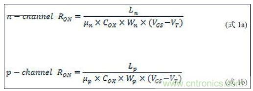 在VIN為各種電平條件下,p溝道和n溝道RON的并聯(lián)值形成并聯(lián)結(jié)構(gòu)的RON特征(圖2)。RON隨VIN的變化曲線(xiàn)在不考慮溫度、電源電壓和模擬輸入電壓對(duì)RON影響的情況下為直線(xiàn)。為使信號(hào)損耗和傳輸延遲最小,理想情況下的RON應(yīng)盡量小。然而,降低RON將增大MOSFET硅片的寬度/長(zhǎng)度(W/L)比,從而造成較高的寄生電容和較大的硅片面積。這種較大的寄生電容降低模擬開(kāi)關(guān)的帶寬。如果不考慮W和L,RON是電子和空穴遷移率(μn和μp)、氧化物電容(COX)、門(mén)限電壓(VT)及信號(hào)電壓、n溝道及p溝道MOSFET的信號(hào)電壓VGS (VIN)的復(fù)合函數(shù),如式1a和1b所示。