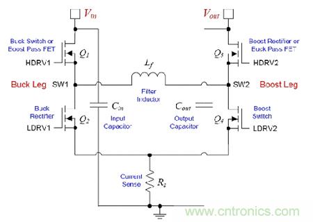 圖1. 4開關同步降壓-升壓轉(zhuǎn)換器功率級。