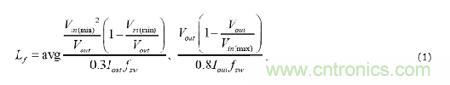 電感取決于輸入電壓范圍和目標峰值到峰值電感器紋波電流比。方程式1分別設定了30%和80%時,深度升壓和深度降壓運行點內(nèi)的目標紋波電流比。