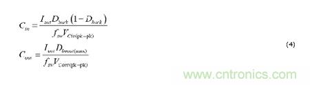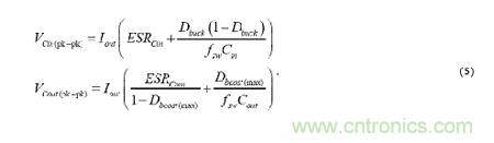 在圖4中,步驟4和5是指分別由降壓和升壓工作模式設定的輸入和輸出電容值。高密度設計越來越多地將數(shù)個X5R-或X7R-介質(zhì)陶瓷元件組合在一起,有時還附帶著一個小尺寸電解電容器來實現(xiàn)大批量儲能功能。方程式4使用針對峰值到峰值的紋波電壓,在假定沒有等效串聯(lián)電阻 (ESR) 紋波分量的情況下設定基線電容估計值。
