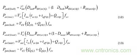 方程式12和13分別計算降壓和升壓模式下的傳導、開關和柵極驅(qū)動損耗。針對降壓-升壓模式的相應表達式是方程式12和13的權(quán)重組合,其依據(jù)是降壓-升壓窗口中的運行點,并且將頻率除以2。