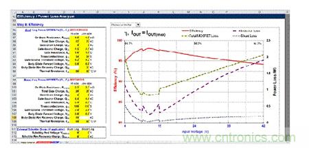 圖5. 步驟8是指MOSFET技術規(guī)格、效率曲線圖和功率損耗分析。