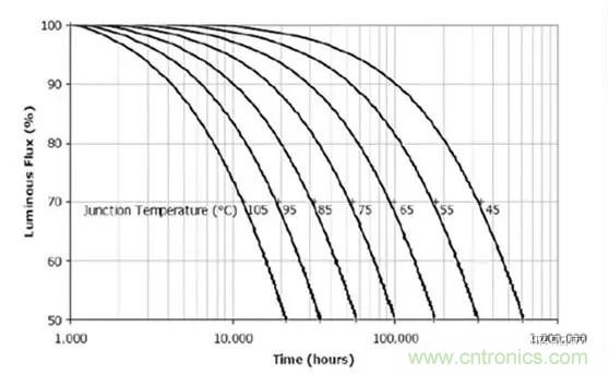 如果環(huán)境溫度是105℃,那么還至少要加上20℃才是結(jié)溫,所以結(jié)溫就大約是125℃。在這個曲線上已經(jīng)查不到了,只能大致地估算其壽命只有4,000小時。這是絕對不能接受的!也就是說,LED泡殼里的環(huán)境溫度必須大大低于105℃!