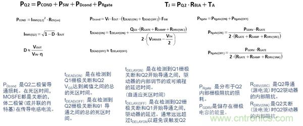Q1工作在硬開關(guān)條件下,在小占空比或高頻(> MHz)時(shí)以開關(guān)損耗為主,開關(guān)性能受同步管Q2影響:快速di/dt可導(dǎo)致反向恢復(fù)損耗增加,快速dv/dt有可能引起Q2誤導(dǎo)通, 造成Q1、Q2直通現(xiàn)象,導(dǎo)致額外的損耗。另外,值得注意的是,由Q2體二極管導(dǎo)致的反向恢復(fù)損耗、 Q2輸出電容導(dǎo)致的輸出電容損耗主要耗散于控制管Q1上 [Ref. 1,2]。因此,在計(jì)算Q1的開關(guān)損耗和溫度時(shí)必須綜合考慮到Q2的影響。另外,Q1的導(dǎo)通阻抗隨結(jié)溫上升而上升。結(jié)溫越高,導(dǎo)通阻抗越高,導(dǎo)通損耗就越高, 使得結(jié)溫進(jìn)一步上升。因此,對(duì)Q1的導(dǎo)通損耗必須循環(huán)反復(fù)計(jì)算,直到管子的溫度計(jì)算結(jié)果穩(wěn)定下來(lái)。